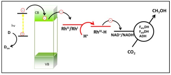 Three moles of NADH is required to produce one mole of CH3OH from CO2 (Figure 3), therefore, NADH regeneration is necessary [35]. To provide the possibility for practical application, a hybrid enzymatic/photocatalytic approach for efficient converting CO2 into methanol was recently proposed [35]. The proposed approach includes two processes: the enzymatic transformation of CO2 to methanol promoted by NADH, and the in situ photocatalytic reduction of NAD+ to generate NADH using semiconductors with the expected mechanism shown in Scheme 3. As a result, 100 to 1000 mol of CH3OH can be produced from 1 mol NADH, creating the possibility for practical application. More recently, a photocatalyst/biocatalyst integrated system for highly selective methanol production directly from CO2 was reported [42]. The system was obtained by combining a newly developed graphene-based photocatalyst with sequentially coupled enzymes (FDH, FaldDH, and ADH) as depicted in Scheme 4.
