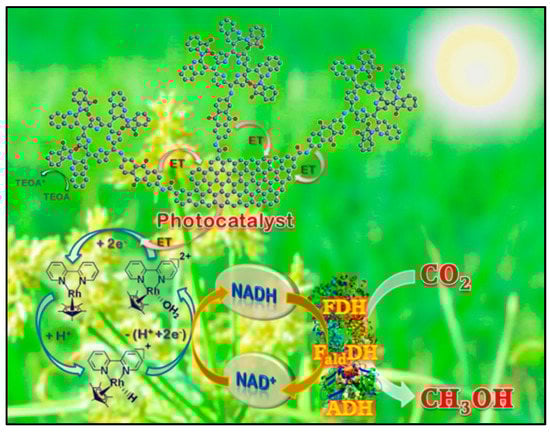 To generate NADH, novel graphene-based visible light active photocatalyst which covalently bonded the chromophore, such as multianthraquinone substituted porphyrin with the chemically converted graphene as a photocatalyst of the artificial photosynthesis system was reported [32]. The rhodium complex shuttles as an electron mediator between the graphene photocatalyst and NAD+, proving to be an efficient factor for regeneration of the NADH cofactor. Recently, a photocatalyst–biocatalyst coupled system developed using graphene-based visible light active photocatalyst in a highly efficient manner, leading to high NADH regeneration (54.02% ± 0.61%), followed by its consumption in exclusive formic acid production (144.2 ± 1.8 µmol) from CO2 [33].