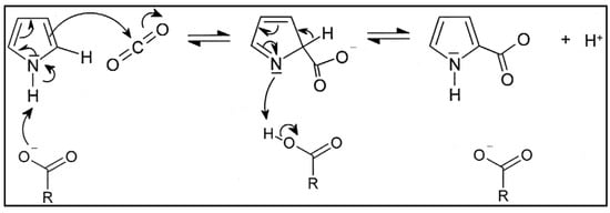Pyrrole-2-carboxylate, a potential herbicide employed in the synthesis of various pharmaceuticals, can be synthesized from pyrrole and CO2 using pyrrole-2-carboxylate decarboxylase, which was obtained from Bacillus megaterium PYR2910 (as shown in Scheme 5) [83,84,85]. The bioconversion yield was limited to 77–81% by the reaction equilibrium [84].