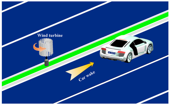 The Chinese government views highway construction as an important strategy for stimulating economic growth, and has built a nationwide network of highways. By the end of 2015, the highway mileage of China reached 123,500 km [1], and this number will keep increasing. According to dynamic monitoring data of the highways in 23 Chinese provinces, the total highway traffic flow was 516 million in July 2016 [2]. High-speed vehicles moving on highways produce strong disturbances to the air and transmit energy to the wake in the form of localized wind energy. The potential of the localized wind energy is high, considering the large amount of mileage and traffic flow that occurs. The idea of recovering energy from the wakes of vehicles has previously been proposed in several studies. Taskin et al. designed a combined solar and wind system to be planted in the median strip of highways, which uses a multi-stage Savonius rotor to generate power from the wind produced by cars [3]. Krishnaprasanth et al. designed a maglev turbine for highway wind power generation [4]. The above two studies are still at the design process, and no theoretical, numerical or experimental analysis has been given. While in the prototype stage, a Savonius turbine [5] and a hybrid wind turbine composed of a Darrieus rotor and a Savonius rotor [6,7] were designed and tested. These prototype studies showed the feasibility of using wind turbines to generate power from the wakes of moving vehicles. However, these tests are quite simplistic and no additional information about the wake field was given; also the mechanism of the interactions between the car wake and the rotor was unclear.