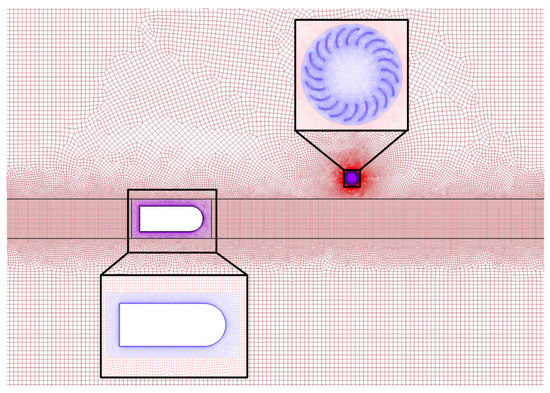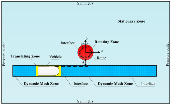 Figure 3 presents the computation domain and the boundary conditions. The computation domain was a rectangle with a length of 300 m and a width of 70 m, which was large enough to allow for the development of the flows. The turbine was placed in the center of the rectangular domain. The car moved horizontally and had a gap of d to the edge of the rotor. The position of the car was denoted as (x, y). The overall domain was split into several zones, including a rotor zone, a vehicle zone which is composed of a translating zone and two dynamic mesh zones, and a stationary zone containing the cells in the outer region. A sliding mesh method was used to realize the rotation motion of the rotor. For the vehicle, a combined sliding mesh and dynamic mesh method was used. In the simulation, the translating zone translated along the interfaces and the mesh in the adjacent dynamic mesh zones was updated at the end of each simulation step. The boundary conditions included pressure outlet boundaries on the left and the right, symmetry boundaries at the top and the bottom edges, no-slip walls on the surface of the rotor and the car, and interface boundaries at the overlap edges between the adjacent zones.