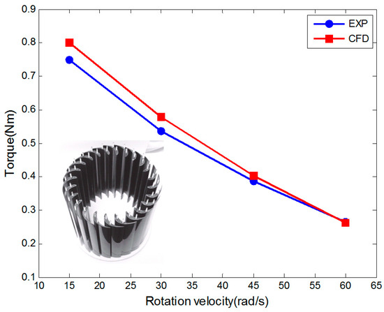 A validation study was conducted using a very similar wind turbine presented by Chiarelli et al. [26]. The validation simulations were performed using the two-dimensional CFD model by replacing the left boundary with a velocity inlet, and removing the car. The experimental rotor had a diameter of 0.25 m, a height of 0.21 m, and the testing wind velocity was 15 m/s. Figure 5 shows a comparison of the torque calculated using the CFD method with the experimental data, over a range of rotor rotation velocities. It was seen that the torques were in very good agreement with the experimental results, except for a slight overestimation at a rotation velocity of 15 rad/s, where the relative error is 6.8%.