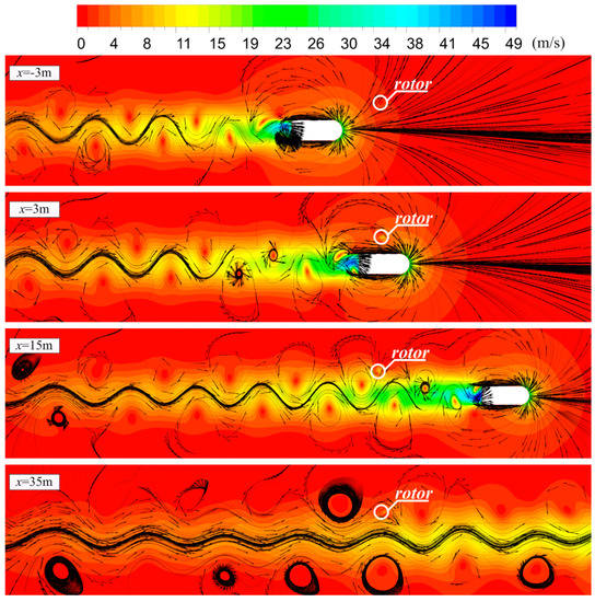 In order to understand the interactions between the car and the rotor, the contours of velocity and streamlines for Case One, ω = 4 and at different car positions are presented in Figure 6. Flows separated from the surface of the car and formed a repeating pattern of swirling vortices, which was similar to the Kármán vortex street. The vortices shed from the opposite sides of the car had different rotation directions, with those close to the rotor rotating counterclockwise.