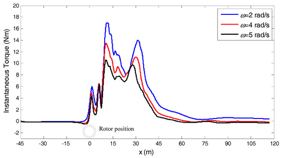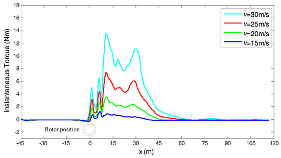 The instantaneous torques of the rotor at ω = 4 rad/s and at four car velocities, were plotted with respect to the position of the car, as shown in Figure 10. It can be seen that the curve of torque was entirely lowered with a decrease in the car velocity. Besides, the region of the positive torque was narrowed with the decrease of the car velocity. This illustrates that the car with a higher velocity has a stronger and longer effect on the torque of the rotor. The drop of torque finally led to the drop in generated energy.