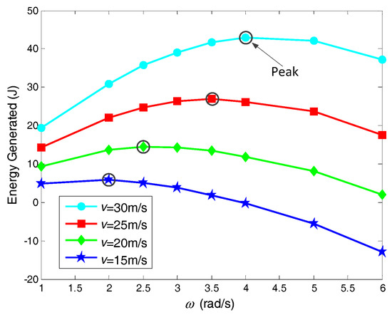 To quantitatively investigate the influence of the car velocity, Figure 9 shows the relationship between peak E and , along with a quadratic function that fit this data. This quadratic function is defined as . The rotor at 15 m/s predicted a peak E of 5.79 J (obtained at ω = 2 rad/s); while for the case of 30 m/s, the peak E increases to 43.02 (obtained at ω = 4 rad/s), and is 643% higher than the 15 m/s situation.