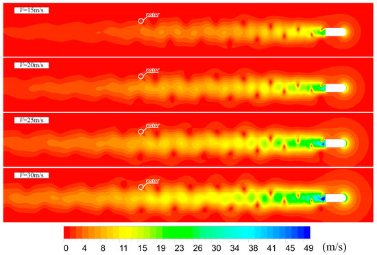 To explain the reason for the change of the rotor’s torque, the contours of velocity at x = 45 m are presented and shown in Figure 11. Both the length and the width of the car wake increased with the velocity, this means that the car has a larger region where the torque of the rotor is influenced. The velocity in the car wake also increased with the car velocity. A stronger wake contains more kinetic energy to drive the rotor. This explains why the curve of torque was higher at higher car velocities.