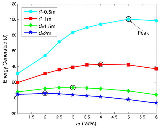 The gap between the car and the rotor, d, is another important factor that affects the performance of the rotor. Cases 1 and 5–7 were used to study the influences of the gap. Figure 12 shows the E vs. ω curves of the rotor for four different gaps, d = 0.5, 1, 1.5 and 2 m. It can be seen that the E vs. ω curve was entirely lowered with the increase of d, and the decrease in E was faster at a smaller d. The rotational velocity of the rotor corresponding to the peak E also decreased with a increase of d. This means that the rotor rotates faster and generates more power when the gap between the car and the rotor is smaller.