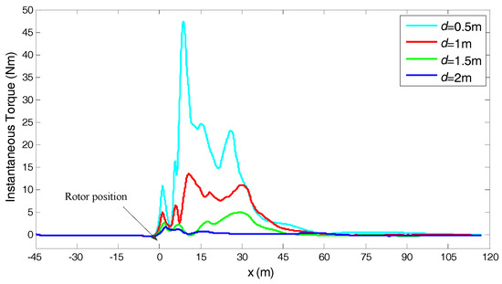 The instantaneous torques of the rotor at ω = 4 rad/s and at four gaps, are plotted with respect to the position of the car and shown in Figure 14. It can be seen that the curve of torque was lowered with increasing d. Besides, the region of the positive torque was narrowed with increased d. This illustrates that the car passing the rotor with a larger gap has a weaker and shorter-lived effect on the torque of the rotor.