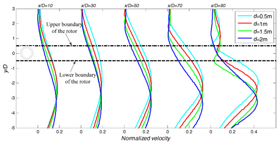 The velocity was normalized according to , where is the upstream flow velocity and is the velocity of the car. The two axial distances, x and y, were normalized using the rotor diameter according to x/D and y/D, respectively. It can be seen that except for the curves at x/D = 90, the velocity profiles were approximately axisymmetric, with the axes of symmetry located in the middle of the car. At x/D = 90, it was close to the rear of the car, and the flow was greatly influenced by the wake vortexes of the car, and showed some fluctuation between −0.5 < y/D < 0.5. For the other cases, the velocity was higher near the axes of symmetry, and decreased gradually to zero away from the axes of symmetry. Because of the gap, the axes of symmetry were biased to the −y direction. For the four cases, the profiles of velocity are similar except that the offset of the axes of symmetry increased with d. Due to the bias of the velocity profiles, the velocity directly upstream of the rotor, as plotted between the two dashed lines in Figure 15, changed regularly with d. The larger the values of d, the smaller the velocities at all upstream distances.