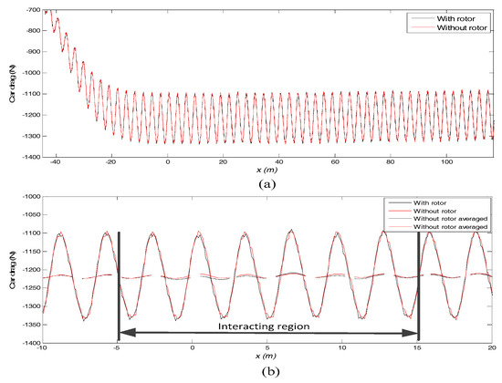Although the rotor can extract energy from the wake of the car, it causes a blockage in the flow field of the car and this may increase the car drag. Therefore, the balance between the rotor generated energy and the energy of the car against the additional drag was investigated. Two cases were compared to show the relationship between the two kinds of energies. The first case was performed at v = 30 m/s, d = 1 m and ω = 4 rad/s, while the second one was the same except that the rotor was removed from the numerical model. The car drags of the two cases were then compared, as shown in Figure 16. Due to the periodically shed vortexes from the surface of the car, the drag changed periodically with nearly constant period and amplitude. No big differences were observed between the drags for the two cases in Figure 16a, this meant that the influence of the rotor on the drag of the car was weak. To more clearly show the changes, the drags are plotted between −10 m < x < 20 m together with periodic moving average curves. From the moving average curves, that the car drag increased slightly between −5 m < x< 15 m, this illustrates that the rotor causes additional drag on the car when it passes by the rotor, and the interacting region is limited to approximately 20D.