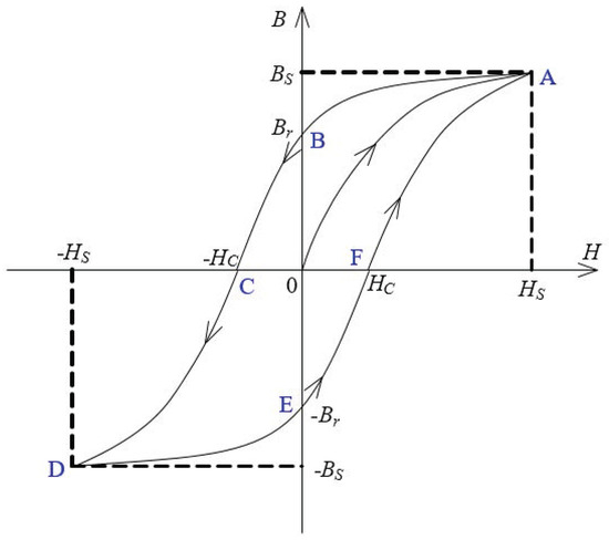 Ferromagnetic material exhibits nonlinear properties and hysteresis properties that can be described by the hysteresis loop shown in Figure 1. As shown in the figure, the magnetic field intensity H doesn’t increase proportionally with the magnetic flux density B. Due to the continuous rising of the magnetic field intensity, the magnetic flux density tends to reach the saturation state as indicated by the curve between the origin and point A. When the magnetic field intensity decreases, the magnetic flux density decreases by following a different path as shown by the curve connecting points A, B and C. As magnetic field intensity changes periodically, its relationship with the magnetic flux density is expressed by the closed loop, namely, as the hysteresis loop, as shown in Figure 1. is the magnetic flux density when H decreases to zero. is known as coercivity, which is the magnetic field intensity when B increases to zero. The magnetic flux density when the material reaches the saturation state is called the saturation flux density . The Jiles–Atherton hysteresis model, which is derived from the physical views of the magnetization process, can simulate the hysteresis phenomenon effectively. The J–A model decomposes the whole magnetization into two components, namely, reversible component and irreversible component :