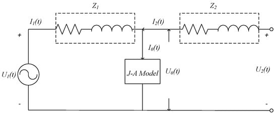 A precise transformer model depends on the accurate description of its magnetic characteristics. The characteristics exhibit non-linear, hysteretic, and dynamic behavior due to eddy and anomalous losses in electrically conducting magnetic materials. In this paper, to model the power transformer, the Jiles–Atherton (J–A) model [23,24] was used for its accuracy and ease in numerical implementation. The original J–A model is based on the energy-balance equation, which describes hysteresis loops of soft magnetic materials by simulating the magnetization process by using domain wall motion with pinning effects. By using only five parameters, the J–A model can give a detailed and reasonable expression for the hysteresis characteristics of the soft magnetic materials.