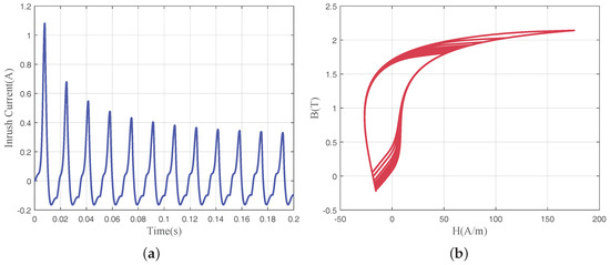 Inrush current curve (a) and the corresponding Hysteresis loops (b).