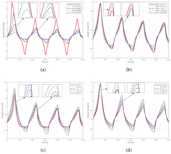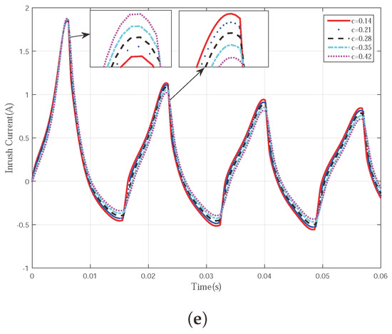 The characteristics of each J–A parameter is studied quantitively. The main concept of this study is to compare the inrush current curves generated by different J–A parameter combinations. Each combination is generated by changing the value of one parameter while fixing the value of the rest. The initial values of the five J–A parameters are set as , , , , and . The changing rate of each parameter is 25%. For example, the initial value for is . Then, the other four different values for are , , and . The corresponding five inrush current curves for five different are plotted in Figure 4a. and c are fixed at the initial value. The same operation is applied on the rest of the four J–A parameters and the corresponding results are shown in Figure 4b–e, respectively. Parts of the figures are enlarged for better observation.