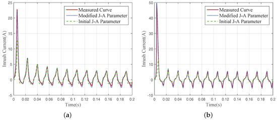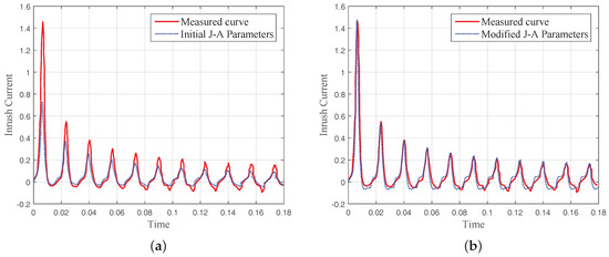An initial set of J–A parameters, as is shown in the second row of Table 2, is estimated from the corresponding hysteresis loops. The inrush current simulated by the initial parameters is compared with the measured one in Figure 3a. As can be observed, the simulated inrush current cannot match the measured one well. The first two crests are not high enough. Parameters that affect the first two crests should be adjusted firstly. According to our analysis of the five J–A parameters in Section 3, we can perform the following actions to make the simulation more accurate.