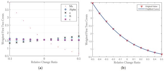 The impact of each J–A parameter on the weighted crest value () is shown in Figure 7. In order to further improve the efficiency of the searching process, the discrete value shown in Figure 7a can be polyfitted into a continuous polynomial as shown in Figure 7b. The case for is shown in the figure, and the discrete value for can be fitted by the polynomial , where x is the relative change ratio. The polynomial method can be treated as a finer and faster searching method. Based on the polynomial function and the measured crests value, the searching range for can be defined as the interval between initial value and target value. Thus, the value for can be modified within the searching region in order to reduce the difference between simulated and measured first and second crests.