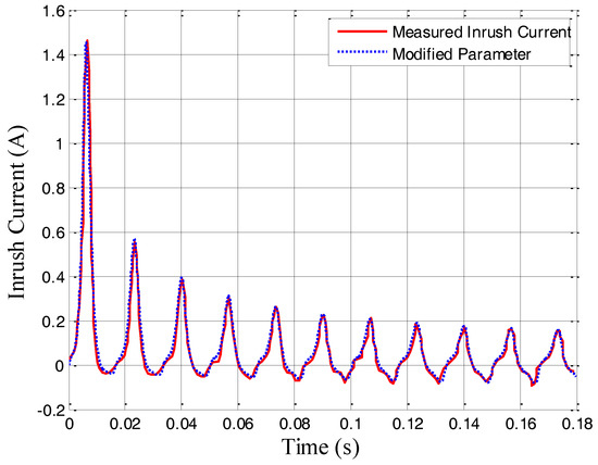 - The primary parameters are tuned firstly to reduce the large difference between the simulated inrush current and the measured one. Since the curve is more sensitive to the primary parameters, the simulated one can approach the measured one quickly. In this case, both and a are reduced to increase the height of the first and second crests.