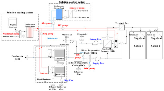 The high heat demand required for regenerating the desiccant solution in the cooling operation of the proposed system might reduce the advantages of replacing the chiller. In addition, a free heat source, such as the waste heat recovered from the engine, should be supplied to meet the required heating load for cooling and heating operations. As a non-vapor compression HVAC system, the proposed system showed desirable energy saving potential in marine applications under various climate conditions.