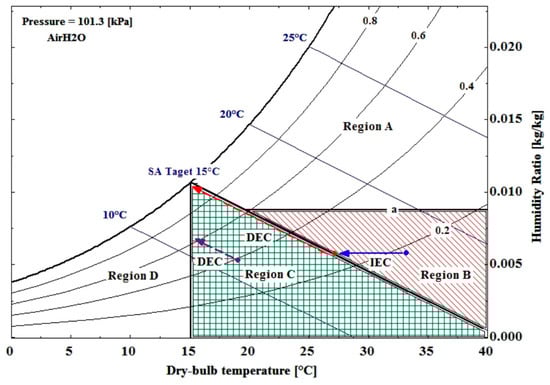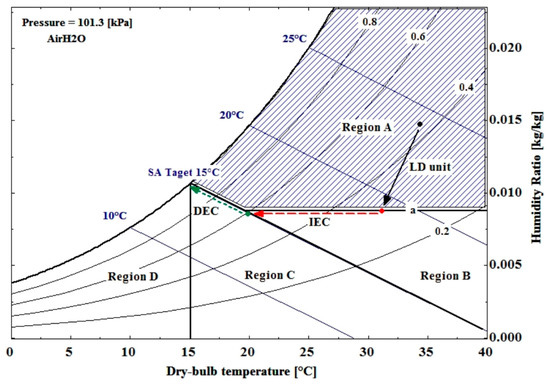 In regions B and C, the LD-IDECOAS is operated based on the sensible cooling of the outdoor air; hence, the LD system is deactivated. The induced outdoor air bypasses the LD and sensibly cools in the IEC, to meet the supply air target temperature. The DEC is operated to provide adiabatic cooling in order to meet the supply air condition. The boundary between the regions B and C is defined by the outdoor air enthalpy line. If the enthalpy of the outdoor air is lower than that of the target supply air condition (i.e., 15 °C or 42.1 kJ/kg), the condition corresponds to region C, for which the target supply air temperature can be met by only operating the DEC (Figure 4).