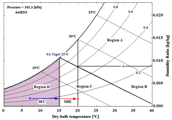 The outdoor air in region A is hot and humid [2]. To meet the target temperature of the supply air, the LD-IDECOAS should be operated at its full capacity. As shown in Figure 1, initially, the moisture from the outdoor air is removed using the LD system, until the humidity ratio represented by the line “a” on the psychrometric chart is obtained. After the dehumidification process, the process air is adjusted to the supply air set-point temperature (i.e., 15 °C), by sequentially passing it through the IEC and DEC. The process air entering the IEC is sensibly cooled, and subsequently, adiabatically cooled in the DEC. Before the supply air is supplied to the room, the supply air should reach a target temperature of 15 °C; moreover, the supply air should be saturated (Figure 3).