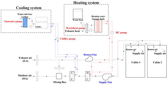 In marine applications, conventional vapor-compression systems are typically used as air conditioning systems. In ISO-7547 [5], the air conditioning method used in marine spaces was similar to that used in buildings (i.e., conventional constant air volume (CAV) and VAV systems). In addition, the ASHRAE handbook states that HVAC systems proposed for marine spaces are based on the standards for building air conditioning systems [6].