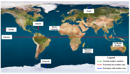 The peak thermal loads of the model space were estimated using the calculation method recommended by ISO-7547, which utilizes the load calculation procedure and basic assumptions that are critical for designing HVAC systems serving passenger cabins in ships [5]. In ISO-7547, the outdoor air condition with a 35 °C dry bulb and 70% relative humidity was suggested for the summer design condition, and a −20 °C dry bulb was provided for the winter design condition. The design room air conditions used a 27 °C dry bulb and 50% relative humidity for the summer and a 22 °C dry bulb for the winter. ISO-7547 does not specify the design humidity level for the outdoor air and the room air for winter operation. The design conditions provided in ISO 7547 should only be used in normal climate regions and not in extremely cold or hot climates. Hence, to estimate the thermal load of the design space under various climate conditions, the ASHRAE design weather conditions [19] were employed for seven selected climate regions (i.e., three normal climate regions, two extremely hot climate regions, and two extremely cold climate regions) (Figure 7). Accordingly, the simulations of both the LD-IDECOAS and the conventional CAV system were performed.