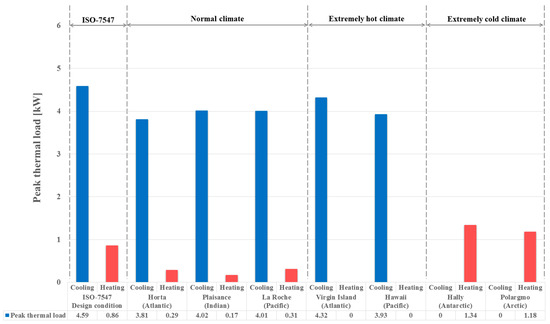 The peak cooling and heating loads of the model space were initially estimated based on the design outdoor air conditions and the load calculation procedure proposed in ISO-7547. However, the design outdoor air conditions suggested by ISO-7547 could not accommodate extremely hot or cold climates. Consequently, the ASHRAE design outdoor air conditions [19] for seven representative locations, including extreme climate zones, were considered to estimate the peak cooling and heating loads of the model space. Figure 8 shows the peak thermal loads of the model space estimated for each design outdoor air condition. The results show that the peak thermal loads estimated under the ISO-7547 design outdoor air conditions were 4.59 and 0.86 kW for the cooling and heating loads, respectively. The peak cooling loads in both the normal and extremely hot climate regions were lower than those estimated under the ISO-7547 design outdoor air conditions. However, the peak heating loads estimated for the extremely cold climate regions were higher than those under the ISO-7547 design outdoor air conditions. Alternatively, as listed in Table 2, outdoor air design conditions were not recommended for the heating load calculation in the extremely hot climate regions or cooling load calculation in the extremely cold climate regions. Consequently, as shown in Figure 8, the peak heating loads in the extremely hot climate regions and peak cooling loads in the extremely cold climate regions were zero.