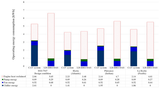 Figure 9 presents a comparison of the operating energy consumptions of both systems under the peak cooling load conditions estimated for the design outdoor air conditions, as recommended in ISO-7547, as well as those of three representative regions with normal climates in the Atlantic, Indian, and Pacific Oceans. The results show that the energy consumptions of the fan and pump in the LD-IDECOAS were higher than those in the conventional CAV system under each design outdoor air condition. This is because of the additional fans and pumps in the proposed system, which were not required in the conventional system. However, the increased energy consumptions of the pump and fan in the LD-IDECOAS were compensated for by the decreased operational demands of the chiller; the chiller of the CAV system consumed a significant amount of energy.