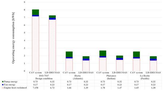 In marine applications, the heating energy required for both the LD-IDECOAS and CAV system could be supplied by the waste heat reclaimed from the engine [15,16,17,18], which is a free heat source. The heating energy consumptions of both of the systems were compared by considering the operating energy consumptions, except for the heating energy. Thus, this result represents the operating energy consumption during the heating season, considering the energy consumptions of the fans and pumps of both the LD-IDECOAS and CAV system. The results show that the operating energy consumption of the LD-IDECOAS was 39% lower than that of the CAV system under the peak heating load estimated for the ISO-7547 design condition. The reduction in the operating energy of the proposed system was similar under the peak heating loads estimated for the other normal climate regions.