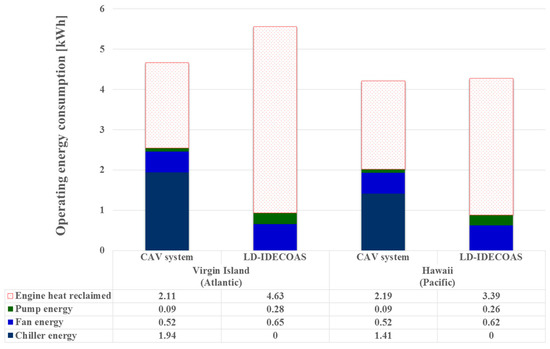 Figure 11 shows a comparison of the operating energy consumptions of both the LD-IDECOAS and CAV system estimated under the peak cooling loads in two extremely hot oceanic climate regions: the Virgin Islands in the Atlantic Ocean and Hawaii in the Pacific Ocean. As expected, the proposed system showed higher heating energy demands than the conventional CAV system, because the desiccant solution was regenerated. However, the heating energy demands of both of the systems were met by reclaiming the heat from the engine of the ship; therefore, the use of more reclaimed heat in the proposed system was not a significant disadvantage in terms of energy consumption. Moreover, the LD-IDECOAS showed more fan and pump energy consumptions than the CAV system. However, this disadvantage in the proposed system was compensated for by the decreased energy consumption of the chiller. The operating energy consumptions of both of the systems under the peak cooling load conditions were compared by considering the operating energy consumptions, except for the heating energy. The results show that in the Virgin Islands, the operating energy consumption of the LD-IDECOAS was 63% lower than that of the conventional CAV system. Similarly, the operating energy consumption of the proposed system decreased by 56% in Hawaii.