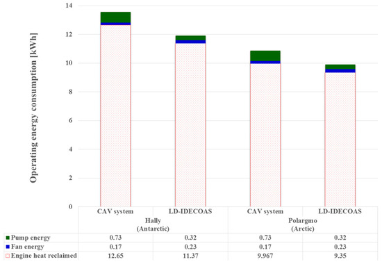 Figure 12 presents a comparison of the operating energy consumptions of both the LD-IDECOAS and CAV system under the peak heating loads in two extremely cold oceanic climate regions: Hally in the Antarctic Ocean and Polargmo in the Arctic Ocean. The results show that the proposed system consumed more fan energy than the CAV system. However, this disadvantage was compensated for by the reduced pumping energy. Although the LD-IDECOAS consumed less heating energy than the CAV system because of the sensible heat recovered from the exhaust air via the SHE and IEC, the heat used in both of the systems was obtained from the reclaimed engine heat, which was neglected in the operating energy comparison. The LD-IDECOAS showed a 39% lower operating energy consumption than the CAV system under peak heating loads in both extremely cold climate regions.