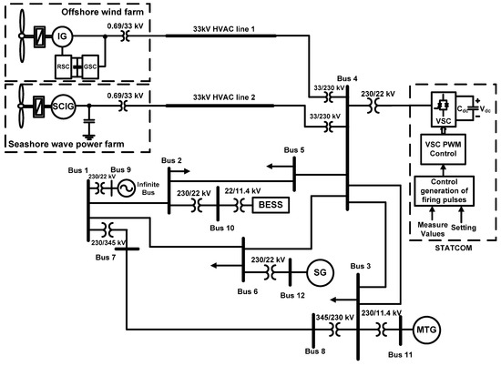 When OWFs and SWPFs deliver or trip a large amount of electric power via the grid simultaneously, the inherent power fluctuations that occur can have adverse impacts on the power quality of the systems to which they are connected. In recent years, the battery energy storage system (BESS) has become more important than ever before because of the growing penetration of intermittent renewable energy sources [4,5,6]. When the BESS is connected to power grid, the BESS should adjust the whole power flow direction according to the renewable energy and load specific to the power multi-system. This paper thus proposes the use of a static synchronous compensator (STATCOM) in order to reduce the power fluctuations, voltage support and damping, and thus improves the transient stability of a 12-bus hybrid power multi-system connected for the integration of wind farms and wave power farms. The multi-system consists of a BESS, a synchronous generator (SG) and a micro turbine generator (MTG).