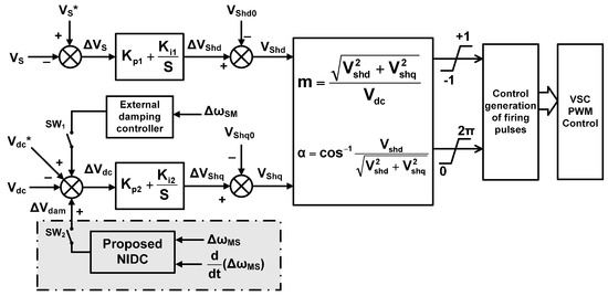 The STATCOM can supply both the capacitive and the inductive compensation to support the bus voltage (VS) by independently controlling its output current. The real current is responsible for controlling the real power, while the active current is used to control the reactive power and exchange it between the STATCOM and the power system. It is also capable of improving the power system stability. The STATCOM is controlled by the external damping controller to damp the reference signal of the dc voltage [8]. The control block of the traditions external damping controller of the STATCOM is shown in Figure 2 (the SW1 is closed and SW2 is opened).