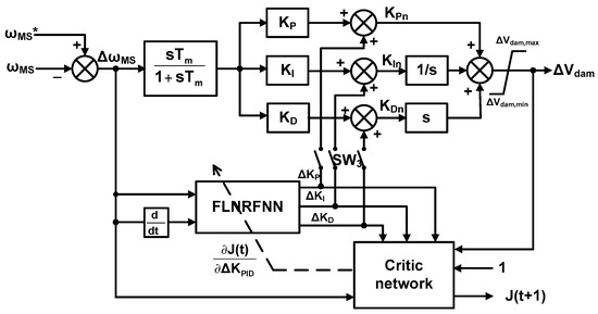 The damping controller input signal should be the rotor speed deviation between the MTG and SG (ΔωMS). The proposed NIDC consists of three parts: the adaptive critic network, the FLNRFNN, and a PID controller, as shown in Figure 3. An FLNRFNN is adopted to implement the function expansion for the FL (Functional Link)-based NRFNN, to improve the accuracy of the function approximation. The adaptive critic network is applied in order to provide suitable training signals for the FLNRFNN controller. The FLNRFNN produces the variation gains values ΔKPID (ΔKP, ΔKI and ΔKD) of the PID controller. Therefore, the proposed NIDC is added to the voltage reference Vdc* of the STATCOM and it is capable of providing near optimal results for complex and hybrid power multi-system connected the integration of the OWF and SWPF systems in order to mitigate the power oscillations and to improve stability.