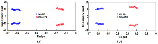 The stable and unstable state of the hybrid system with/without the OWF, SWPF and the STATCOM with/without PID controller can be found by complex eigenvalues λ1–λ21 as shown in Table 1 under 12 m/s and 8 m/s for the OWF and SWPF. The λ1–λ9 refer to the modes of hybrid multi-machine system. The λ10–λ15 refer to the electric modes of the OWF and SWPF. The λ16–λ18 are the modes of wind and Wells turbines. The λ19–λ21 are the modes of the STATCOM. Most of the eigenvalues are fixed on the left side of the imaginary axis. The two sets of eigenvalues λ3 and λ5 are close to the imaginary axis. Hence, from the column with the PID term of Table 1, the λ3 and λ5 of the STATCOM with the PID controller have been prespecified and positioned in the appropriate place on the complex plane. From the column, all eigenvalues are seen to be stable. The λ3 and λ5 are substituted to a characteristic equation. The suitable values of KP = −15.21, KI = −16.89, KD = 10.01 and Tm = 0.58 can be determined. From the analysis of root locus, Figure 4a,b compares the results of root locus for the eigenvalues of rotor angle of MTG δM and SG δS under the OWF from 4 to 20 m/s and the SWPF at 8 m/s. It can be clearly seen that the STATCOM with the designed PID can keep stable operation and move more to the left of the imaginary axis.