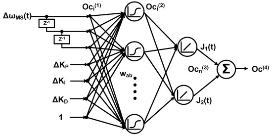 where wab is the connecting weights of the input layer to the hidden layer. The node input of critic network Fi = [ΔωMS(t − 1), Δ(t − 2), ΔKP(t), ΔKI(t), ΔKD(t), 1].