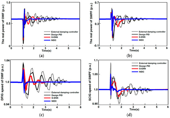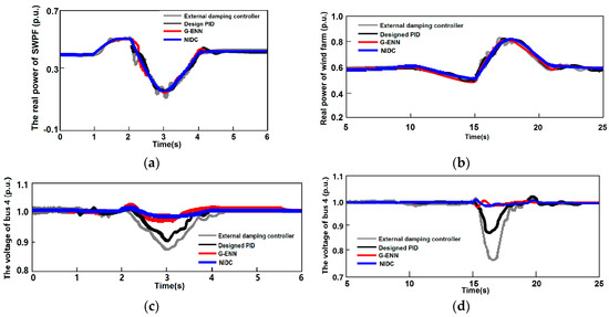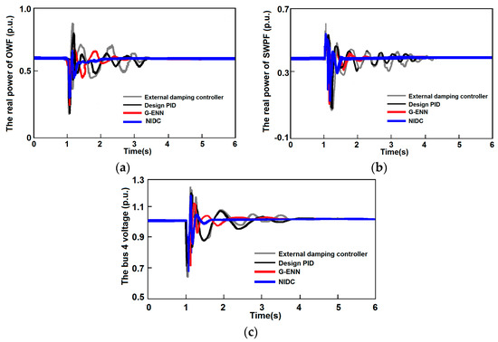 Figure 10 shows the transient responses during the fault of Case 2. Figure 10a,b shows the real power of the DFIG-based OWF and the SCIG-based SWPF connected to the multi-machine system. It can be seen that the STATCOM with the NIDC has a better damping effect and a faster convergence rate than the external linear damping controller, the designed PID damping controller and the G-ENN. From the Figure 10c, the STATCOM with the NIDC can effectively improve the voltage transient stability of bus 4, and a faster voltage recovery is achieved to keep the bus voltage at 1.0 p.u. around 1.6 s.