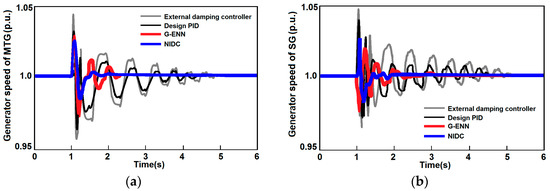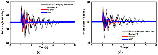 The real power variations during the fault of Case 1 are shown in Figure 7a,b. The STATCOM with the NIDC has a better damping effect and a faster convergence rate than the external linear damping controller, the designed PID damping controller and the G-ENN. The dynamic responses of rotor speed of the DFIG and SCIG are shown in Figure 7c,d. The NIDC generators rotor speed of the DFIG-based OWF and the SCIG-based SWPF can recover more quickly to the steady state around 1.9 and 2.5 s. Figure 8a–d illustrates the rotor speeds of the MTG and SG, and the rotor angles δM and δS of the hybrid power multi-system. It can be found that the proposed method recovers more quickly to their corresponding steady states.