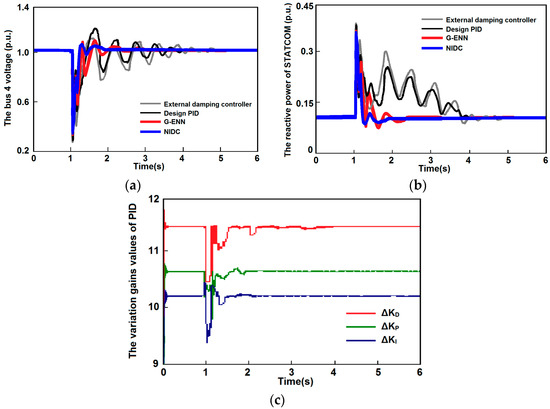 In Case 1, three-line-to-ground fault leads to large fluctuations in voltage at bus 4, thus maintaining that voltage stability is a high priority. Figure 9a shows that the STATCOM with the NIDC can effectively improve the voltage transient stability, and a faster voltage recovery is achieved to keep the bus voltage at 1.0 p.u. around 2 s. Figure 9b shows the STATCOM generates a small reactive power in order to maintain the bus voltage. The FLNRFNN to provide the variation PID parameters, ΔKP, ΔKI and ΔKD are shown in Figure 9c. From Figure 9, it can be seen that the STATCOM with the proposed NIDC has a better transient stability for the hybrid multi-machine system.