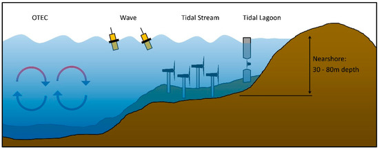 Marine energy technologies: ocean thermal energy conversion (OTEC), wave, tidal stream and tidal lagoon.