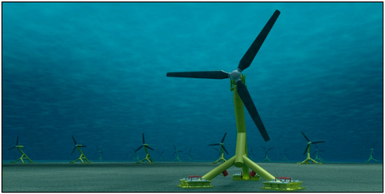 Due to the popularity of this form of device, the present work adopted a horizontal axis turbine as its subject. Due to its prevalence among such turbines which have been tested to prototype stage, we decided to consider only the rigid seabed-mounted design of support structure. A typical example of such a device, manufactured in this case by Andritz Hydro Hammerfest, is shown Figure 2. This 1-MW rated device measures 22 m from base to the center of the blades, and has a blade diameter of 23 m.