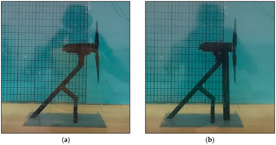 Blockage ratio (the ratio of the frontal area of a blockage object to the cross-sectional area of the flow) is an important factor in the design of experimental models. Blockage ratios in previous experimental studies were found to range from 2% to 16.6% [22,23,24]. In these cases, blockage was calculated based on the total frontal area of the rotating turbine, including the entire swept area of the blades. In some cases, blockage calculated based on static frontal area (i.e., the frontal area of the blades was used instead of the swept area of the blades) was used, though those employing this method were in a minority. Arguably, at the relatively low rotational speed of a tidal turbine, a static blockage ratio may be appropriate, but due to the prevalence of the method in the literature, blockage ratios in this study were calculated using the more conservative swept area method. Blockage ratios for the work described herein were 10.2%. Blockage correction was not necessary in this study since results were used only for direct comparison between the two support structure cases, which have identical blockage ratios.