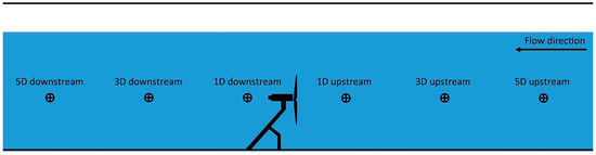 The first set of tests were carried out with the aim of highlighting any differences between the upstream flow pattern and the downstream wakes between the two support structures. ADV data was recorded at three downstream (1D, 3D and 5D) and three upstream (1D, 3D and 5D) positions, in the horizontal center of the channel at turbine hub height (270 mm above channel base), as illustrated in Figure 5.