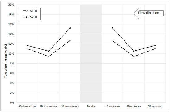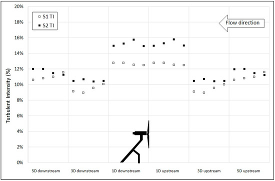 Mean hub height turbulent intensity recorded at 1D, 3D and 5D upstream and 1D, 3D and 5D downstream of turbine mounted on S1 and S2 support structures (4096 samples at 25 Hz per point).