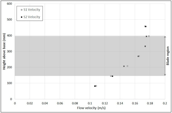 This figure shows similar mean blade plane time-averaged flow velocities between the two support structures, though S1 does exhibit slightly higher velocities, particularly at the positions 207.5 mm and 395 mm above the channel base. However, variation between cases at these points is below the 2% error threshold.