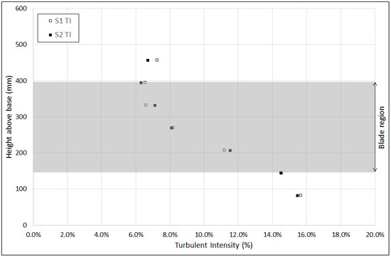Blade plane turbulent intensity is illustrated in Figure 11. This data shows a maximum variation of around 7% between cases, or a difference of around 0.5% TI, with S1 and S2 values at 332.5 mm above the base of 6.6% and 7.1% respectively. Turbulent intensity appears greater in the S1 case at heights above the turbine swept area, and greater in the S2 case over the blade-swept area, though it should be noted that this data was recorded without the blades in place and illustrates only the turbulent intensity generated by the support structure.