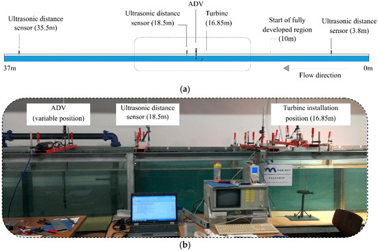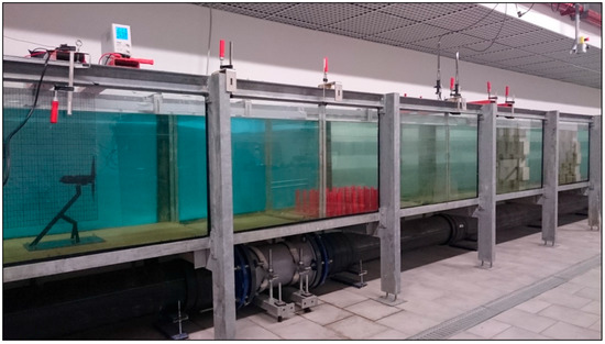 Bulk flow conditions in the channel were measured using a magnetic flow meter (Danfoss MAGFLO MAG3100W and with MAG5000 output module, Danfoss A/S, Nordborg, Denmark) installed on the recirculation system in a pipe manifold measuring 250 mm in diameter. Water depth was monitored using ultrasonic distance sensors (Honeywell 943-F4V-2D-1C0-330E, Honeywell International Inc., Morris Plains, NJ, USA), positioned at 3.8 m, 18.5 m (1.65 m behind the installation position) and 35.5 m downstream from the inlet of the channel. The location of measurement equipment is given in Figure 12.