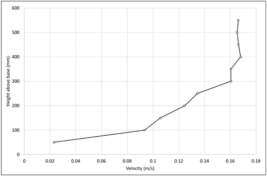 Prior to testing, characterization of the channel was carried out to verify the presence of a fully developed turbulent boundary layer. Time-averaged velocity profiles, each made up of eleven velocity recordings at 50-mm vertical intervals between 50 mm and 550 mm above the channel base, were recorded at multiple streamwise locations along the length of the channel.