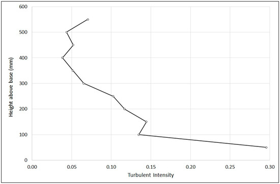 Test 11 gave the closest result to the real case TI values recorded by Thomson et al, so this arrangement was used for all subsequent turbine tests. A full turbulent intensity profile (again without a turbine or support structure in place) recorded at turbine installation position is illustrated in Figure 14.