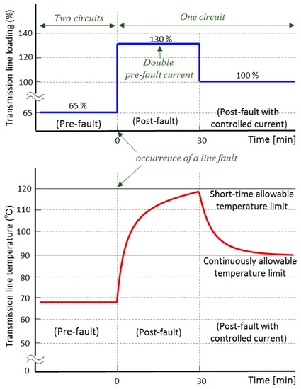 In conventional power system operation, the short-term allowable current limit is determined by simulating the increase in line temperature while assuming a step-change in the current owing to a transmission line fault (N-1 criterion), as shown in Figure 1. This figure assumes that, as the most common case, one of the two circuits is disconnected owing to the clearing of a transmission line fault. As a result, after the transmission line fault has been cleared, the line current is temporarily doubled. Consequently, the transmission line temperature in the non-fault circuit increases based on the thermal inertia of the line conductor (i.e., as in Equation (2)). At this time, if the condition of the line wire allows, the short-time allowable temperature limit can be allowed to rise until 120 °C is reached, which is higher than the continuously allowable temperature limit (90 °C). This increase in the temperature limit causes the wires to degrade. Therefore, the line temperature limit is assumed to be a continuously permissible current limit in this paper. However, the proposed line current variation model can be readily applied in the case of other temperature limits as well.